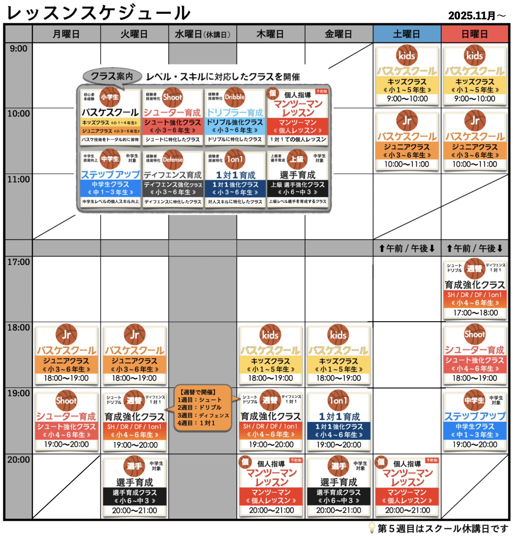 ※ご自身でのレッスン予約が必要なのは「育成強化クラス」に参加される方のみです。 育成強化クラスは、 【 シューター育成クラス 】 ※ご予約は先着順となっております。定員6名に達しましたらご予約をお受けできませんので別日にてご予約ください。